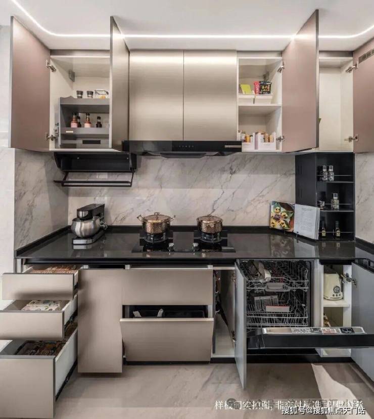厨房的收纳空间几乎能填满整个厨房空间,这些收纳空间不是随意塞满的,而是根据日常烹饪习惯的频率来贴心规划。