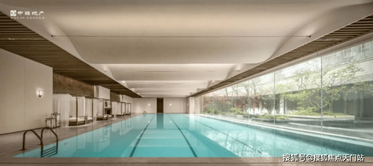 最后来看泳池。云邸玖章做了再升级。改为采用大尺度的落地玻璃拼接,约2.4米宽巨幅玻璃,且通过精致的玻璃交接细节处理增进室内外空间的融合,强调泳池的无界感,真正实现了无边泳池的效果、质的飞跃。
