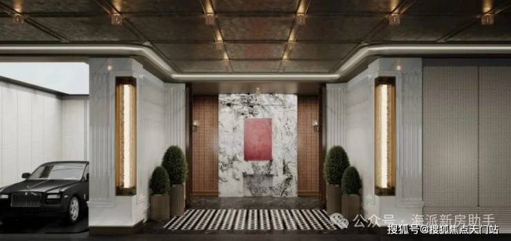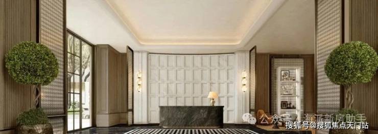 社区主入口更是兼具豪华酒店与海派元素设计风格, 挑高约6米的入户大堂、水系景观与艺术家共创作品 交相辉映,奢华感和高级感拉满!