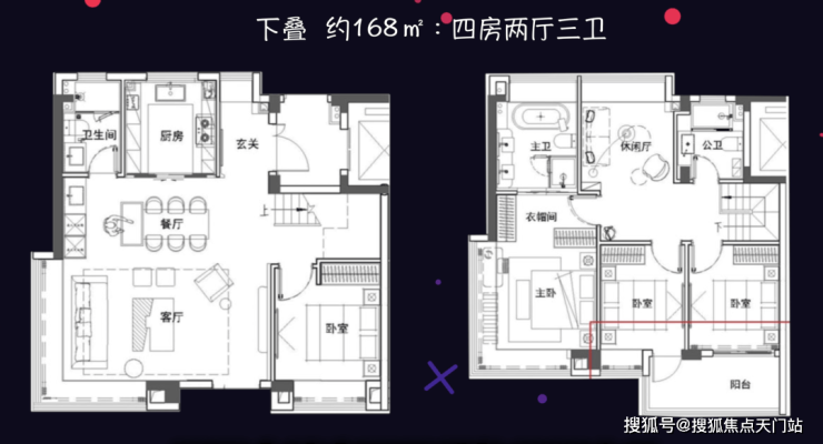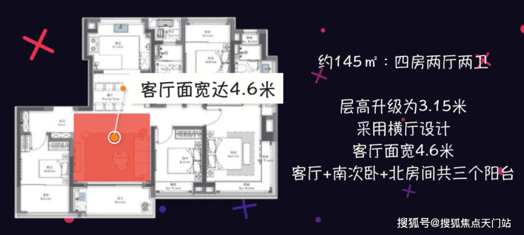 145平4房2厅2卫合计98套,层高升级为3.15米,采用横厅设计客厅面宽4.6米,客厅+南次卧+北房间共三个阳台。
