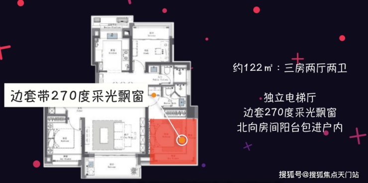 122平3房2厅2卫合计250套,升级独立电梯厅,边套270度采光飘窗,北向房间阳台包进户内。