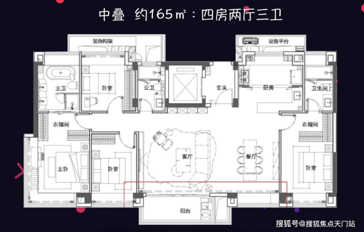 110平3房2厅2卫合计166套,经典飞机户型+独立入户玄关+三开间朝南,比较有特色的是南向双阳台设计,卧室阳台直接包进户内。