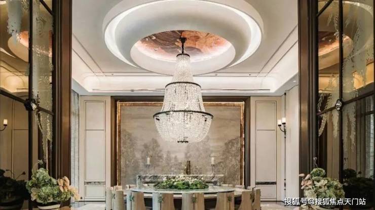 在景观落地窗环绕中,私宴厅以 “花廊序列,美学对景”构筑专属的私谧空间,巨型水晶吊灯与浅色饰面的搭配,色彩质感上相得益彰,营造融合艺术、文化与生活美学的奢享感场域,成就令人神往的优雅社交范式。