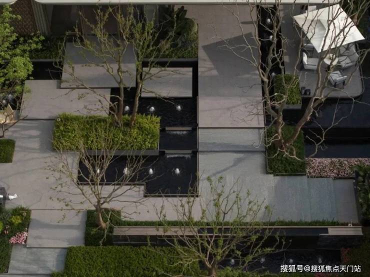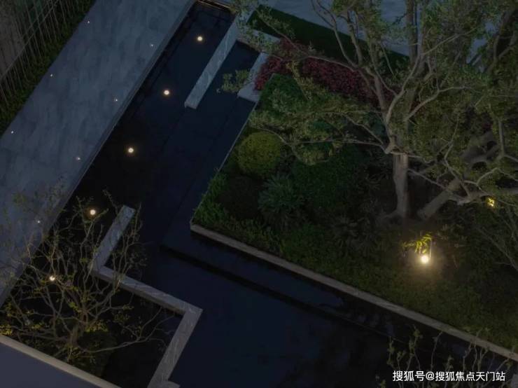 通过建筑门头来到礼仪归家水轴线。层级叠水与叠水景墙结合,再搭配阵列的乔木与草坪灯,形成尊贵归家礼仪感,强调轻奢度假感,始终贯彻现代轻奢度假的设计理念。点缀的涌泉与植物相映成趣,希望每一位业主都能在归家之前恢复平静的心情。通过涌泉、叠瀑、镜面水等多种景观形态,让业主能够感受到人与自然和谐共生。