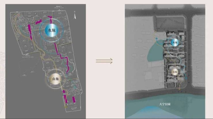 社区内部,设计团队以豫园为灵感蓝本,运用现代手法重新诠释豫园的“山脉”与“水脉”,打造出一座立体起伏的山水园林。