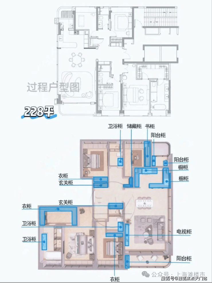 主卧配置步入式衣帽空间、双台盆+大浴缸主卫。
