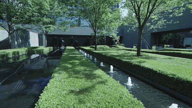 并通过跌水、涌泉和镜面水景等水景组合,将内部水景与外部水岸紧密相连。