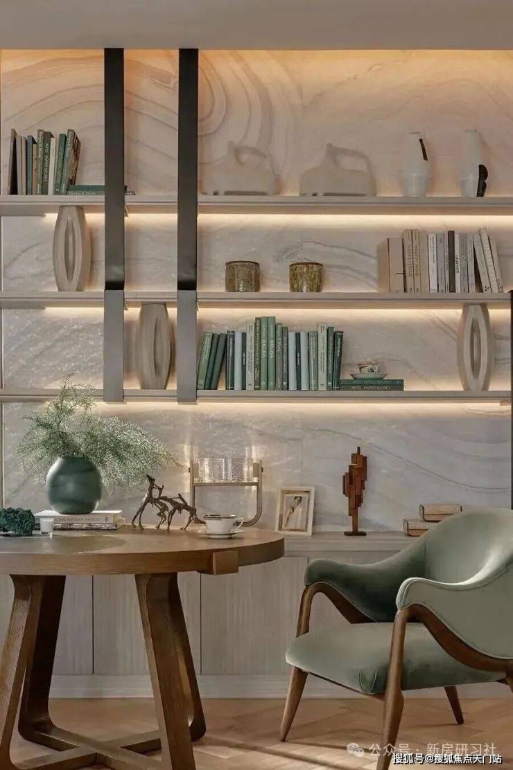 夹层被安置成了书房,安静、雅致,为了显露对生活的慰藉,像是把精神世界现实化的地方,展现修养、审美甚至家风。也如三毛在《送你一匹马》中所说:“许多时候,自己可能以为许多看过的书籍都成过眼烟云,不复记忆,其实他们仍是潜在的。”
