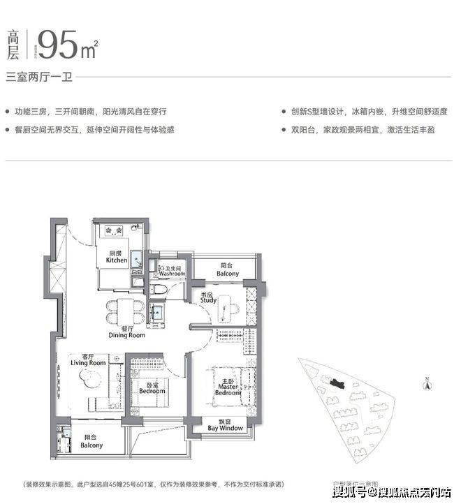 高层户型为建面约95㎡,设计方正且全明,3阳台设计,为业主提供更加舒适的居住环境。