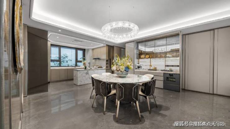 这样的尺度,让多人同时操作毫无拥挤感:半开放式的设计,中餐的煎炒煮炸,西餐的优雅从容,一键切换。家庭成员可围坐岛台煮上一壶咖啡、吃个慵懒的早餐或下午茶也很不错。