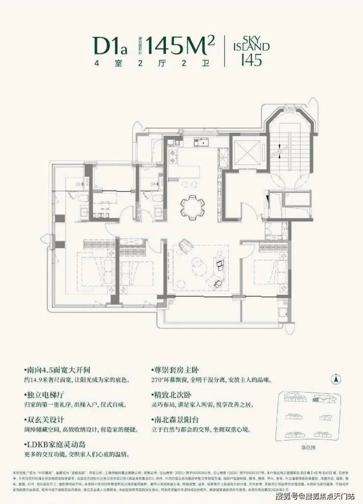 作为“新一极奢宅”代表,SKY ISLAND 145户型,类一梯一户设计,独立电梯厅,营造出私密尊崇的归家仪式感。约97%的高空间使用率,南北通透的格局,南向约15米、约4.5开间巨幕面宽,是对“下一代空间”的深度诠释。