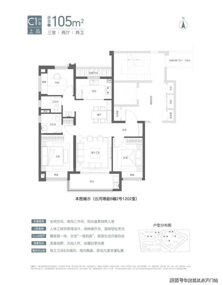 建面约105㎡3房2卫有宽厅和竖厅两种风格,其中宽厅户型好评度颇高。