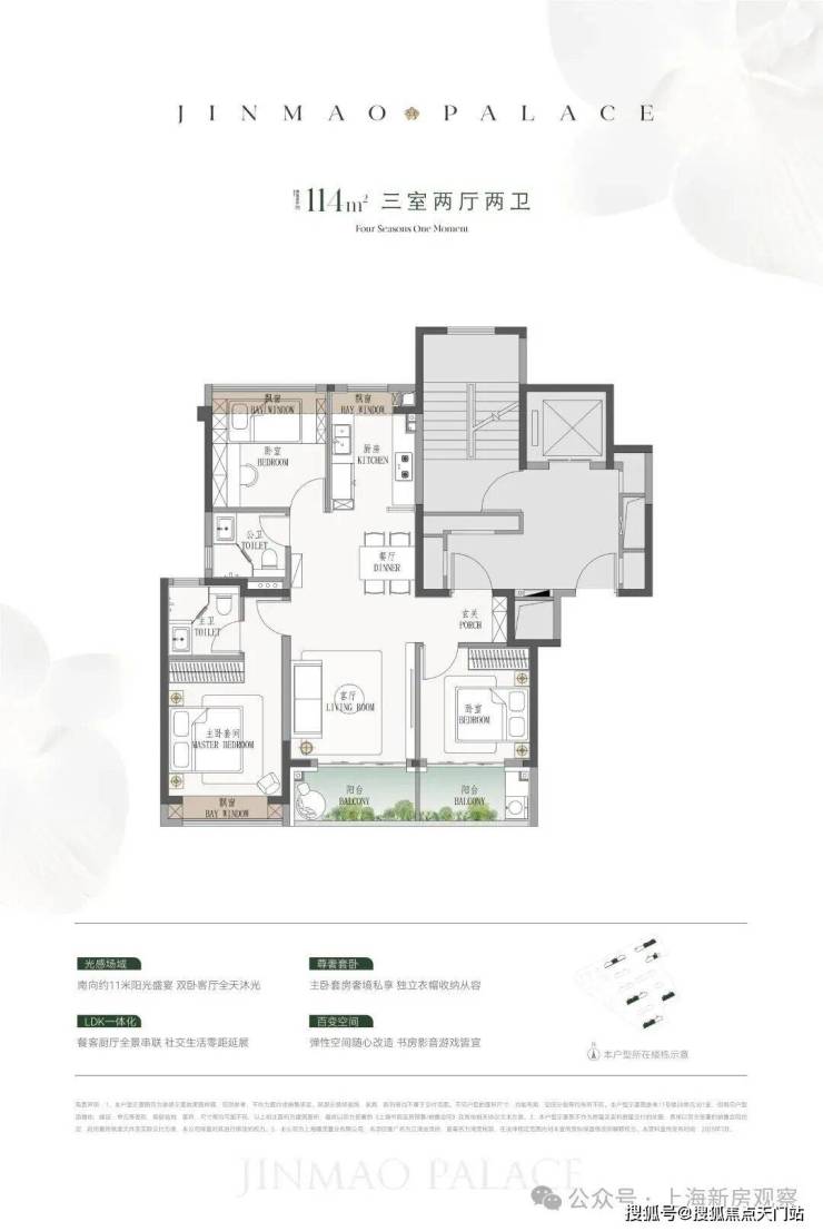 产品方面,预计将推出建面约110-190㎡3至4房产品,四种户型的飘窗与阳台空间都比较大。110㎡户型的阳台将次卧和客厅联通;123㎡是横厅设计;140㎡足足有七个飘窗空间;185㎡各个房间的空间更上一层。