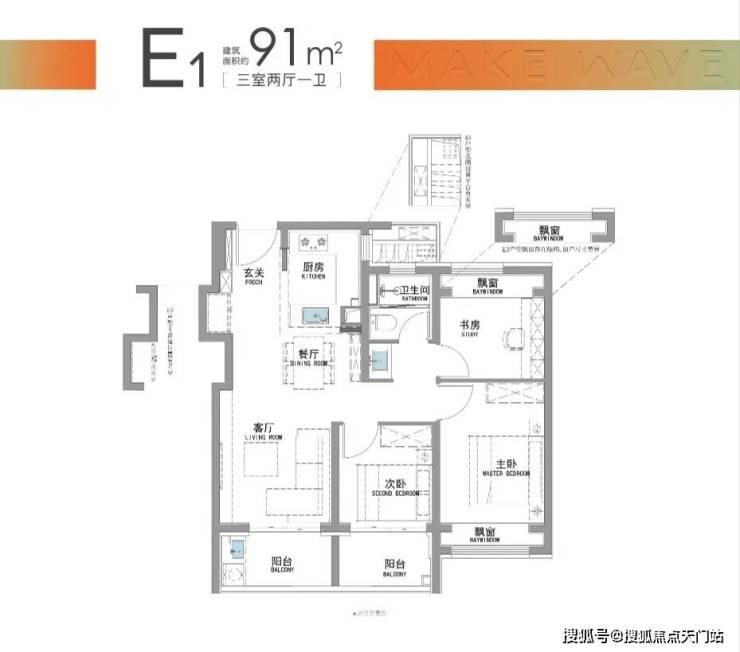 而招商·时代潮派|东屿此次建面约91㎡户型,就做出来了比市面百平户型更好的的“南向双阳台+南北双飘窗”设计。