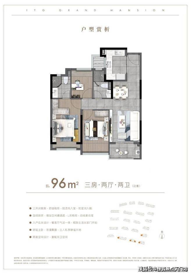 户型方面:约85-96㎡的全三房设计,每一款户型都是会传递出国贸的产品观。南北通透,布局考究,动静分离。