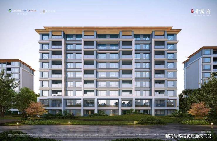 穿过庭院进入社区后, 参考江南“四水归堂”的园林意境与 香槟铝板搭配暖灰色真石漆的建筑立面交相辉映,透出隐逸摩登都会的典雅美感,尽显尊贵却不失潮流的顶级审美!