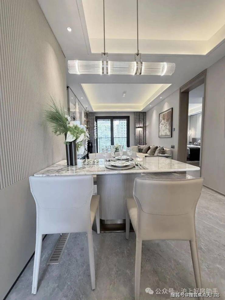餐厅则北连现代化厨房,南北通透的采光设计,让美食与光影共舞。设计师还巧妙地 将传统直墙转化为流畅的S型曲线,不经意间创造出额外的凹槽空间,可以安置冰箱或定制柜体,极大提升厨房的收纳与操作便捷性。