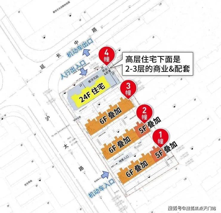 项目采用高低配设计, 总计175套房源,项目由一栋24层高层和3栋5-6层叠墅组成,高层105套(108至123㎡ 3房4房)、叠墅70套(180到220 ),自4层起架于3层商业之上。