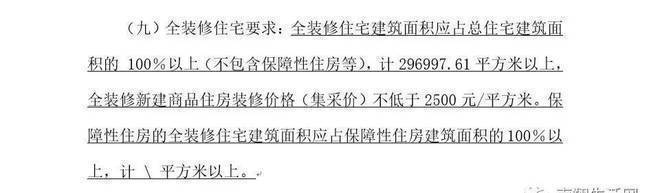 同时明确: 外立面方面明确“金属部分应采用铝板、紫铜等防锈防腐金属材料”等。而内部装修规定则更加明晰: “厨房应采用橱柜、厨电一体化设计,应配置燃气灶、油烟机等,厨电卫生间应设置防水,吊顶应配置浴缸或钢化玻璃淋浴房,配置淋浴龙头和座便器,台盆柜采用石材台面,配洗面盆和水龙头,室内装修须包含地暖、空调、新风系统”