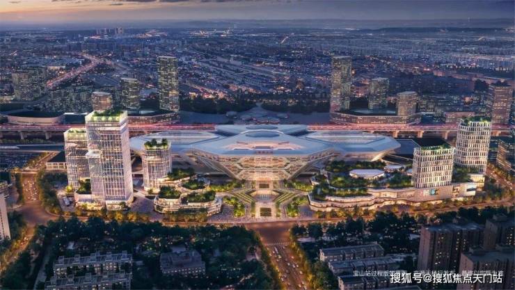 高铁宝山站枢纽总建筑面积约48万平方米。其中,站前广场建筑面积约39万平方米,含酒店、办公、商业综合服务等业态。