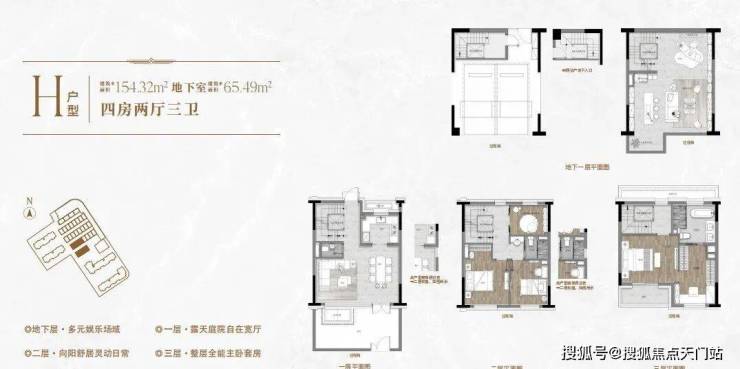 一楼和地下室主社交和志趣,二楼是子女的房间,三楼是主人休憩区。