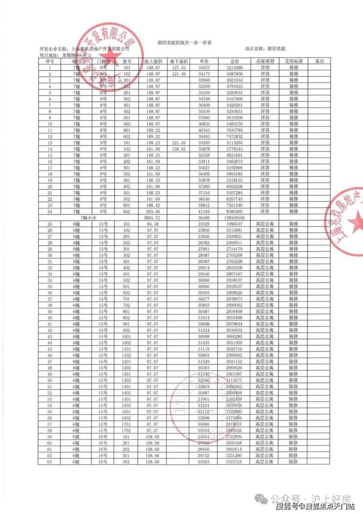 项目一房一价表