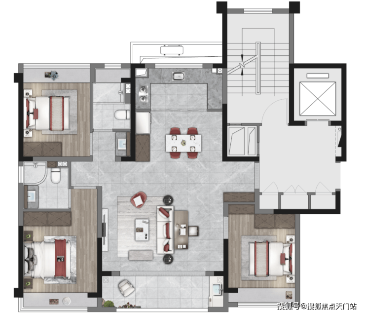 中间的台阶,三层递进,拾级而上,寓意“步步高升”,通过台阶错位的设计丰富归家的礼序,让整个建筑更富有尊贵感。