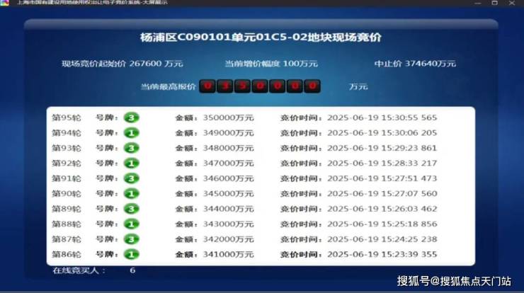 6月19日,保利发展经过95轮竞价摘得杨浦东外滩地块,成交总价350000万元,楼板价95530元/㎡,溢价率30.79%。