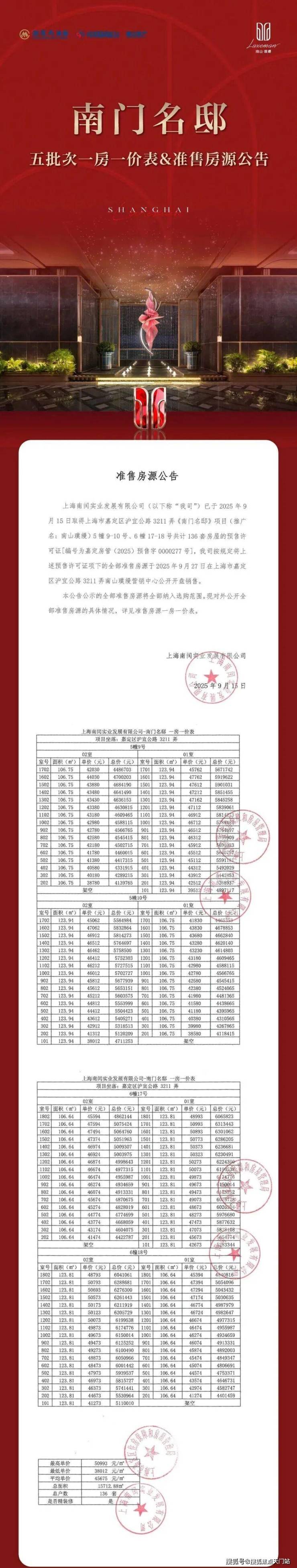 均价 45675 元 /㎡!嘉定主城封面「南山・璞缦」五期已过会,加推 136 套 106-1123㎡3 房,附线上预约通道!