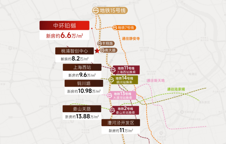 中环铂樾坐拥15号线南大路站(直线约300米),真正实现“地铁到家”的便捷生活。从这里出发, 4站畅达上海西站(新房均价9万+/㎡)、5站轻松抵达铜川路(新房均价10万+/㎡)、9站直达娄山关路(新房均价13万+/㎡),轻松串联城市核心板块。此外,15号线更可快速换乘2/7/11/13/14号线,无缝衔接大宁、虹口、陆家嘴等繁华商圈,商务出行、休闲娱乐皆高效无忧。