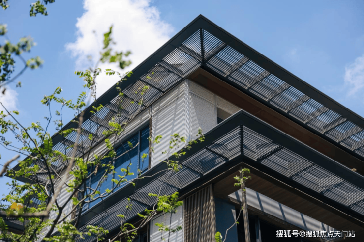 建筑上,宋式三段式立面,深檐挑角,东西双向宋风窗扇、檐下三重宋韵装饰构件、歇山顶(联排)等宋韵呈现,再现宋式建筑风骨;立面横向采用大面玻璃幕墙,实现极致3:7窗墙比的同时又呈现出现代东方审美。最值得一提的是项目立面采用古铜色铝板+木纹铝板+古铜色格栅+仿石铝板+陶土瓦,让建筑本身温润厚重从而历久弥新。