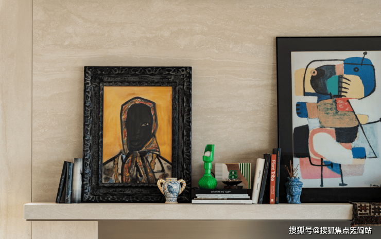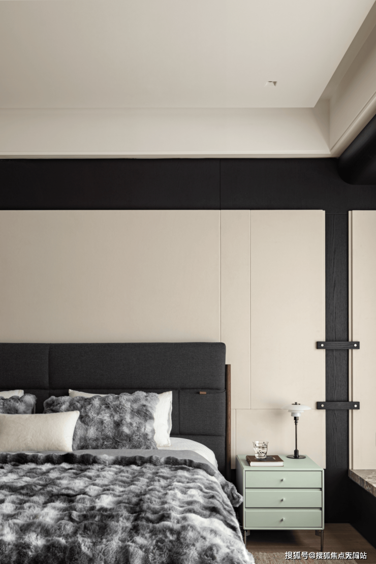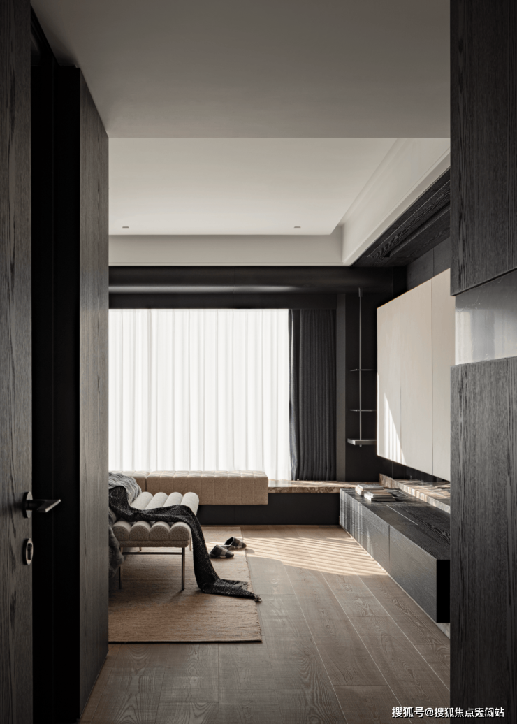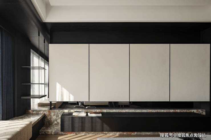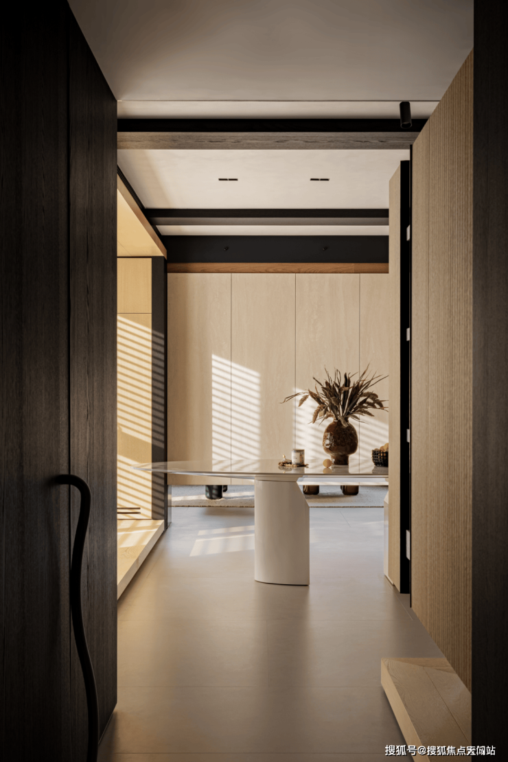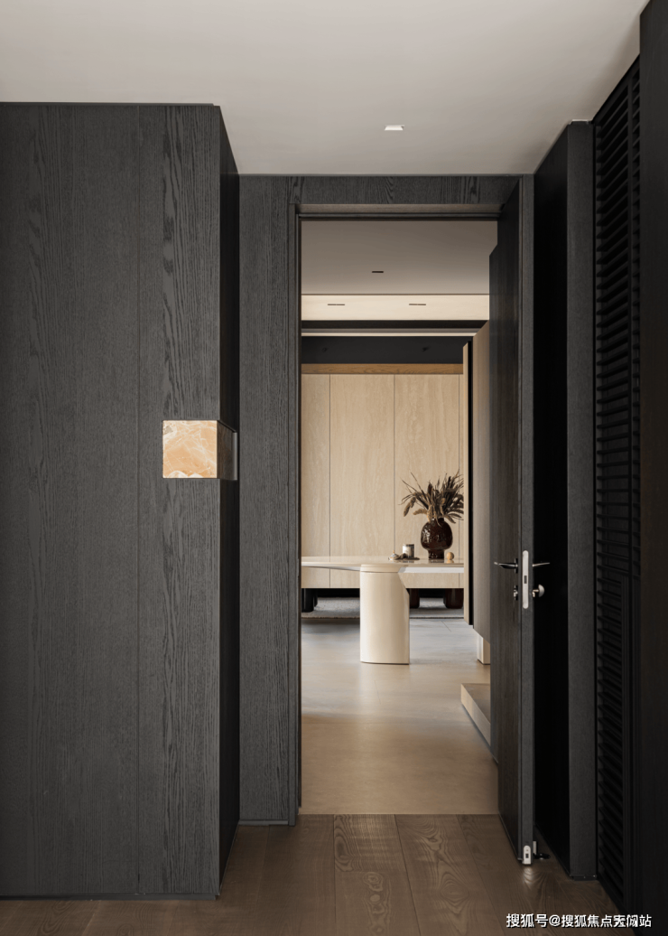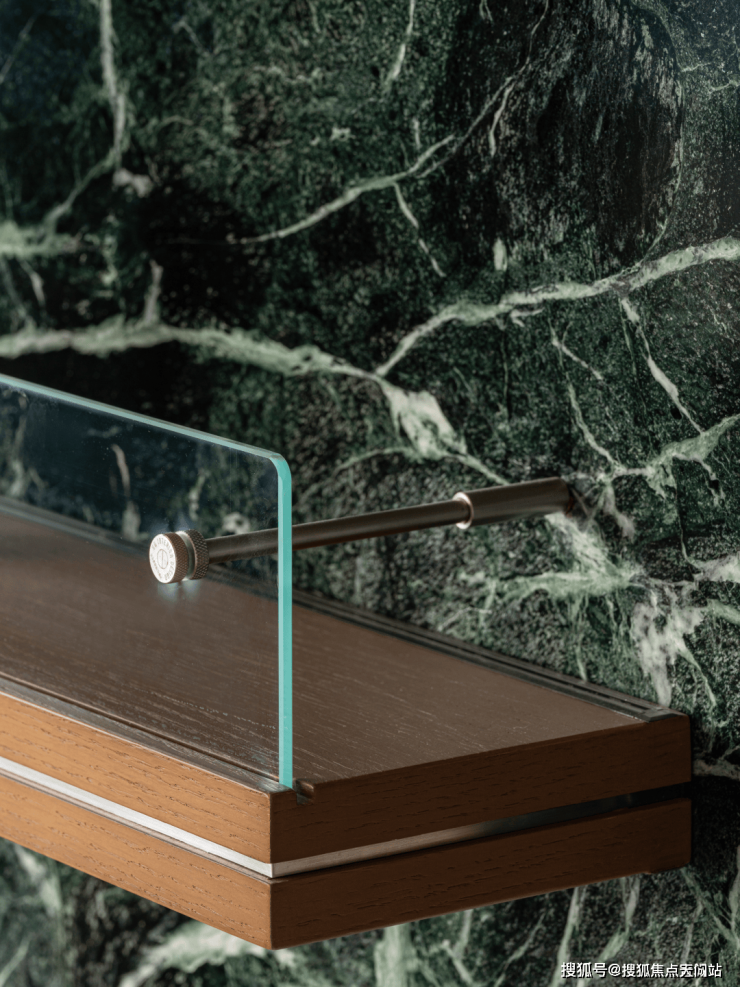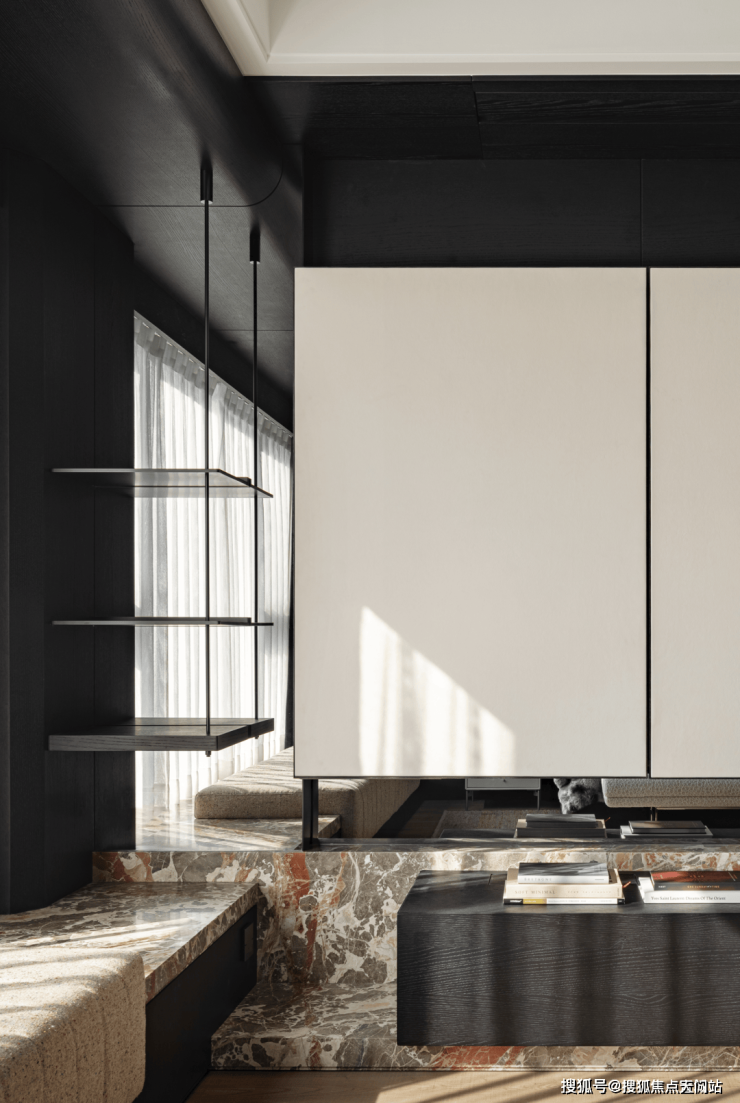 大理石的高低错落与墙面木作系统结合,织物的柔软形成构筑逻辑,沉稳与感性交融,构成一种独特的空间节奏。