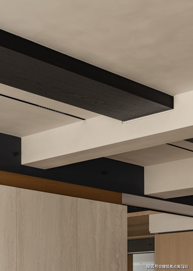 横梁与窗套的材质交织,深色木质的横梁从天花板延伸至空间的深处,带来结构的稳定感与力量感。