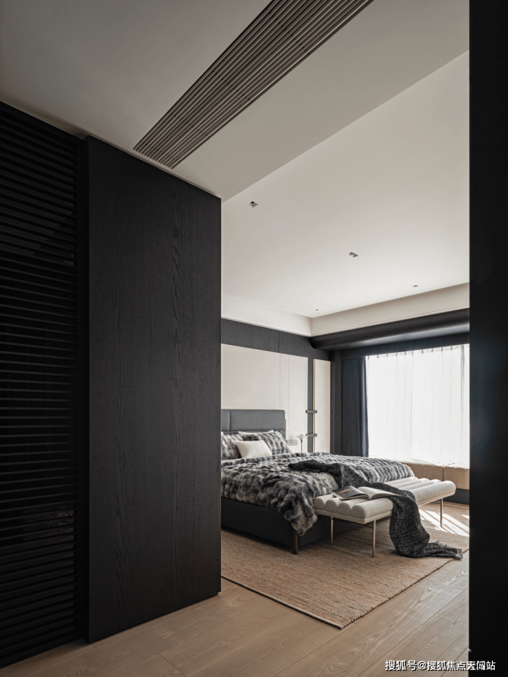 衣帽间成为这首乐章中隐藏的变奏,浅紫色的柜门框与开放柜在克制的色调中跳跃,为稳重的构造注入一丝不经意的趣味。