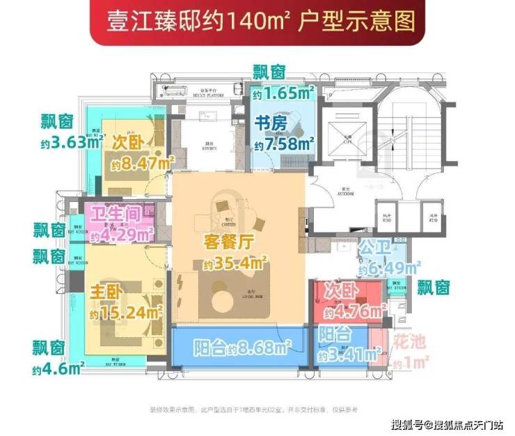 建面约140㎡户型则通过6个飘窗(含2个270°转角飘窗)、2个南向阳台(赠送一半面积)及独享约6.8㎡电梯厅,赠送面积高达约27.2㎡。