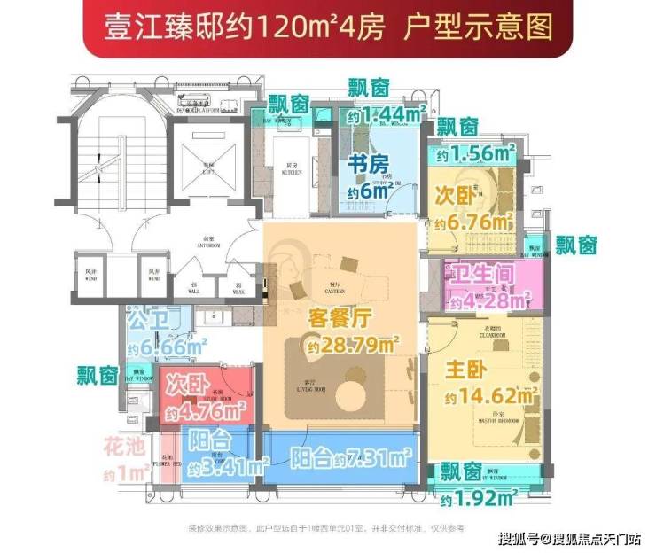 建面约120㎡户型通过6个飘窗、2个南向阳台(赠送一半面积)及独享约5㎡电梯厅,整体赠送面积约18.5㎡。