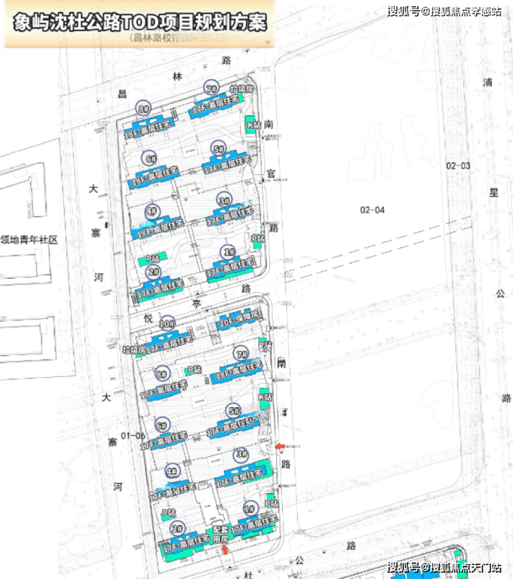 01-03(中间),规划10幢楼,其中一幢为保障房,总高17-18-20层,小区中心位置的商品一楼为架空层,南北楼间距30米。