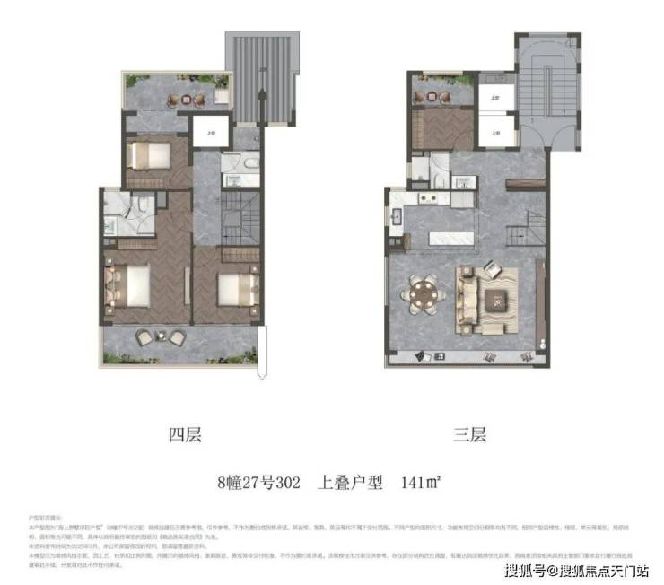 建面约141㎡上叠,餐客横厅设计,会朋宴客尽显风范;上层空间连通露台,可以瑜伽健身、莳花弄草,丰盈生活的厚度;多重卧室设计,功能性更强、更实用。