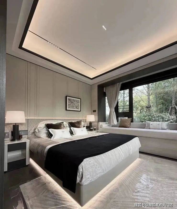 主卧转角落地窗+飘窗,也算是非常少见的了。净面宽约3.6m,不算进门的衣柜,进深大约5.7m左右。根据测算,可以放置宽约2m的床+2个床头柜(宽度约45cm/个)是可以的。