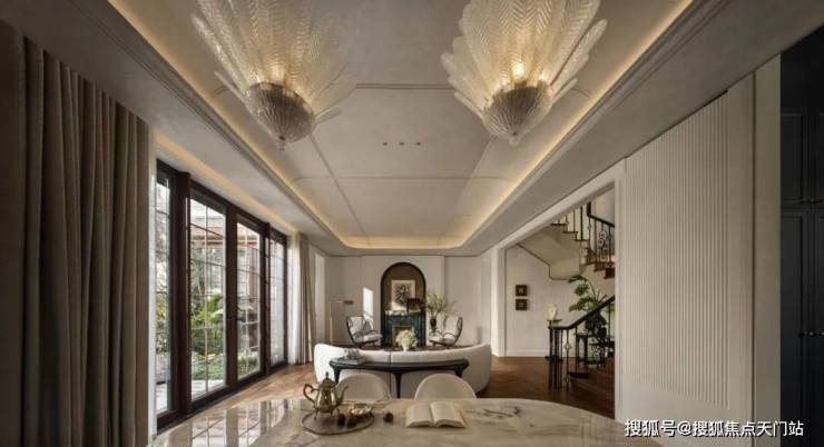 首层|家庭聚场:大开间横厅设计,全景落地窗,将阳光与园林景致最大化引入室内,实现“客厅-餐厅-花园”的无缝衔接,10人位沙发与8人宴客圆桌从容摆放,无需刻意规划便显大家宅邸的社交格局,无论是日常家庭欢聚,还是圈层宴请,都能尽显大宅气度。