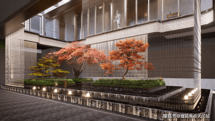 下沉庭院整体长约18米,进深约9.5米,庭院的上下景观通过水帘相连通,中间结合有着层层叠水的水景,搭配水晶砖的景墙,将品质感拉满。