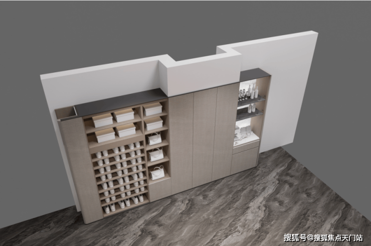 看到约143平户型,厨房岛台和上柜都不稀奇,厨房外的半开放式餐边柜和利勃海尔内嵌式同样也作为交付标准附赠,柜体额外提供接近1立方面积的收纳空间:在约143平户型中,入户玄关收纳区被分为2个部分——一个是进门正对的区域,一个是进门后的步入式区域,两侧都标配有充裕的收纳空间。和约99平户型不同,约143平户型在玄关柜末端还设置有半开放水吧台,丰富生活场景:主卧和约99平户型一样,衣柜更大形成衣帽空间,还交付有半开放式、类似于酒店的迷你吧设计:现场样板房照片长这样: