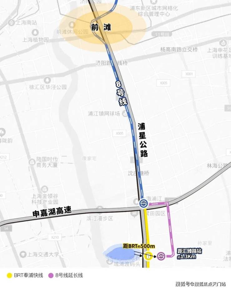 项目距离浦江线汇臻路站约1.3KM,5站即达沈杜公路站并与8号线换乘,可一线直达前滩。或通过BRT快线可一站无缝对接8号线沈杜公路!