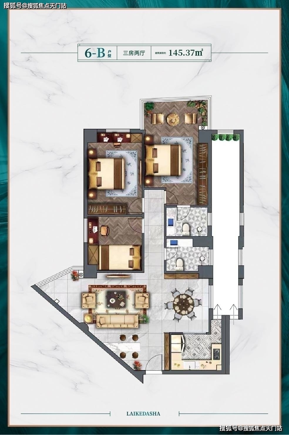 2、户型方正,全屋通透采光,双卫带阳台。