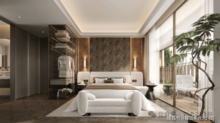 主卧建面约 25㎡,自成一方小天地。除了设计有干湿分离的卫浴空间,还特别打造了步入式衣帽间,满足主人的“收藏欲”;加之南北通透的布局,连接双联阳台,阳光浸润生活,清风鲜活呼吸。