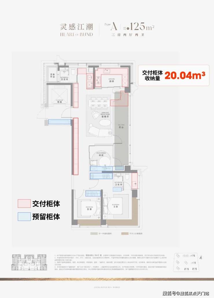 据小胖君手工统计,项目125㎡3房边套户型的整体交付柜子+预留衣柜, 收纳空间可以达到约20.04m³,中间套户型也能达到约16.56m³!