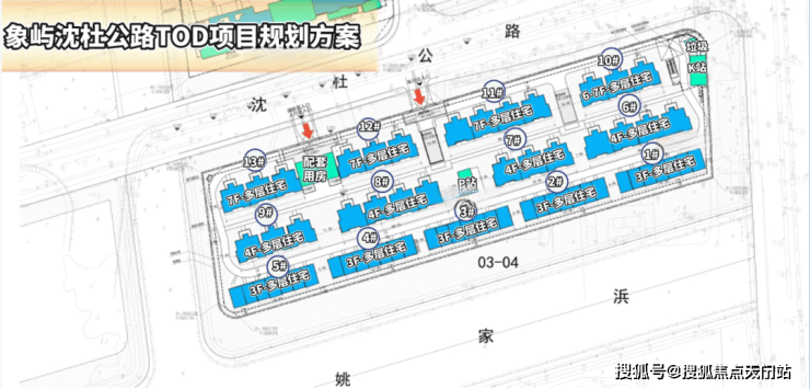 01-03(中间),规划10幢楼,其中一幢为保障房,总高17-18-20层,小区中心位置的商品一楼为架空层,南北楼间距30米。