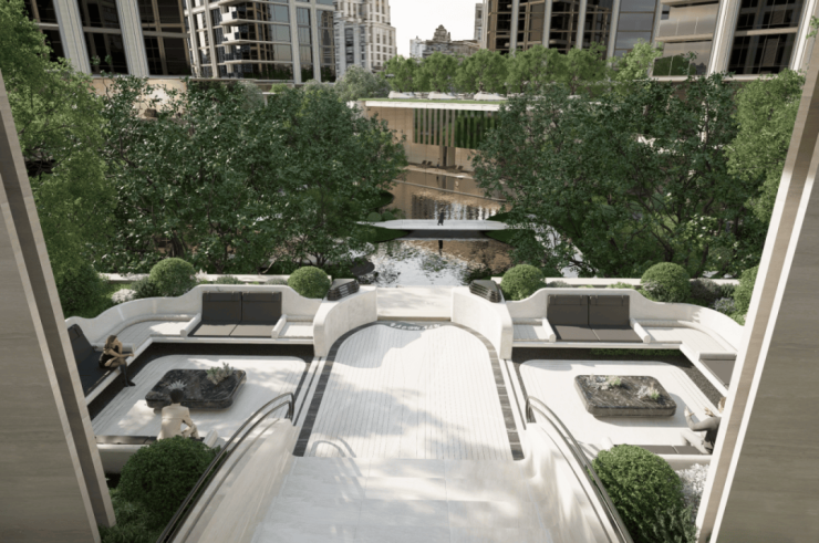 穿过园林,上海最大的约3500㎡下沉水院构成社区的核心灵魂,约13米的高差形成独特的“峡谷绿洲”,将黄浦江的水意象引入社区,中央平静水面与四周的会客舱、茶室、游泳馆形成呼应。
