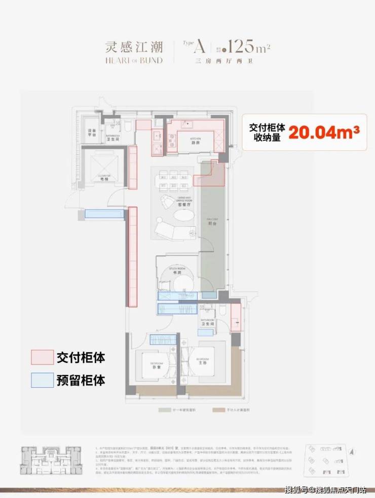 收纳也是项目户型的重点,据沪上好房统计,项目125㎡3房边套户型的整体交付柜子+预留衣柜,收纳空间可以达到约20.04m³(若以28升的行李箱丈量,它能从容收纳200个);中间套户型收纳空间也能达到约16.56m³!