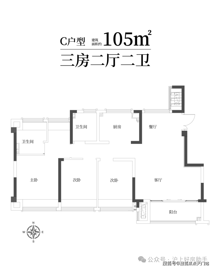 建筑面积约105㎡宽厅三房两卫,四开间朝南,舒适栖居理想